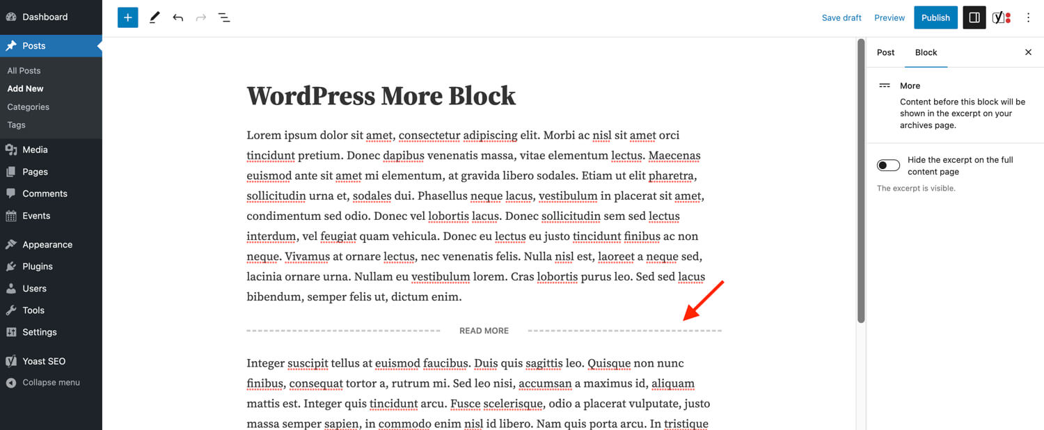 یکی از کارهایی که میتوانید انجام دهید، استفاده از بلوک «بیشتر» داخلی وردپرس در هنگام ویرایش نوشتههاست که به شما این امکان را میدهد تا محل دقیق پایان خلاصه مطلب را تعیین کنید، یا میتوانید از فیلد خلاصه مطلب استفاده کنید و متن دلخواهتان را بهصورت دستی وارد کنید.